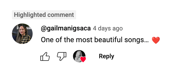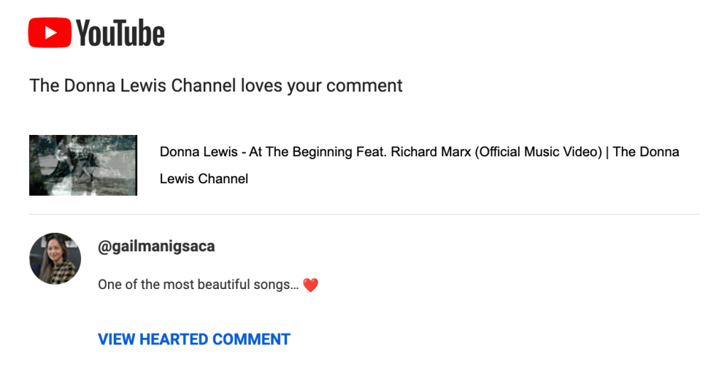 [trigger]: email notification that Donna Lewis’ YT Channel liked my comment and even highlighted it